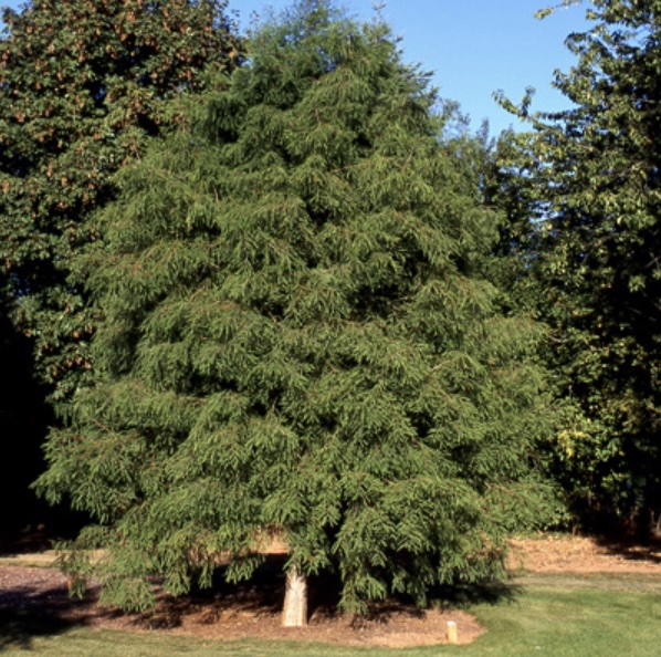 Bald Cypress is a large, pyramidal tree with soft, fern-like foliage. It produces small cones and showcases a stunning orange hue in autumn. This tree thrives in moist locations, making it an excellent choice for wetland areas.