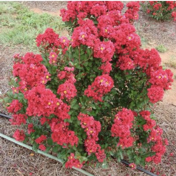 Mid-size early flowering and reblooming crape myrtle with sensational scarlet red clusters. Glossy foliage emerges red then matures to a dark green. Full Sun. 4-5' H x 4-5' W.