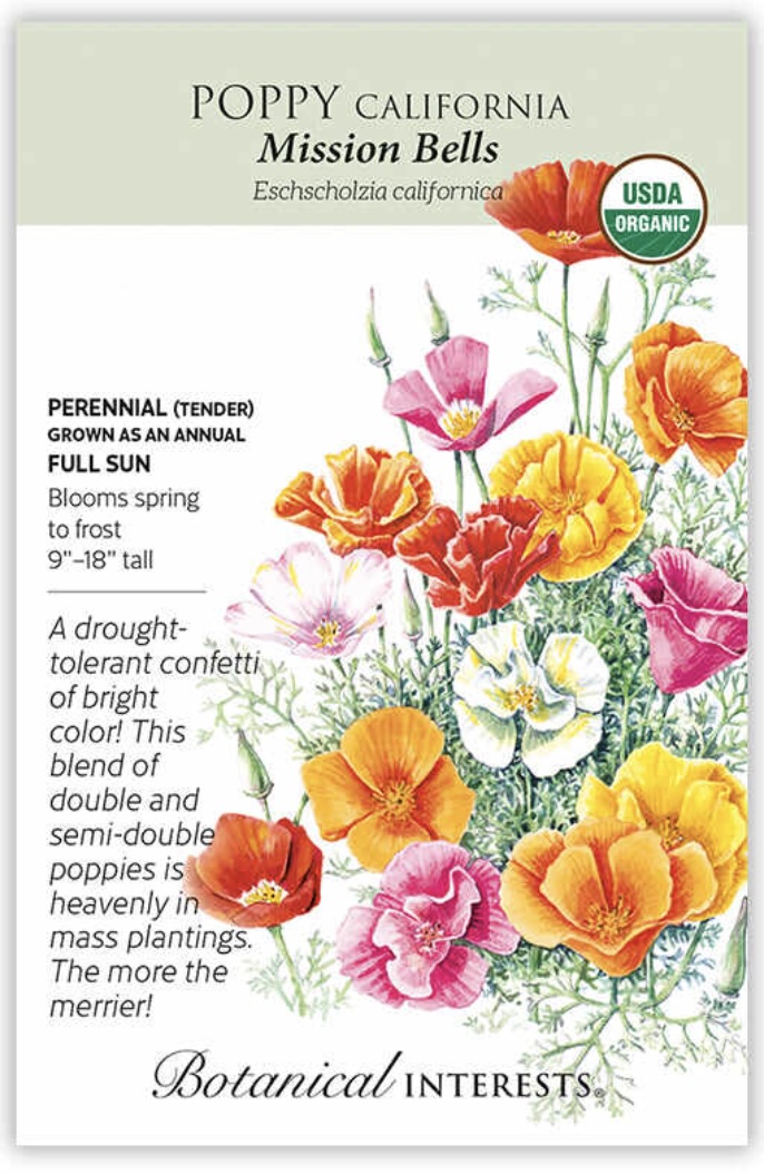Mission Bells' with its stunning, saucer-shaped, bright rose, red, orange, white, and yellow double and semi-double, ruffled flowers is the epitome of summer in a carpet of color. A heat- and drought-tolerant plant requiring little care, it will self-sow, providing years of beauty.Variety Info: 2" 3" rose, red, orange, white, and yellow silky, saucer-shaped flowers with four delicate, slightly ruffled paper-like petals.